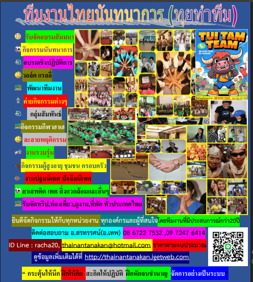 ติดต่อสอบถามที่,วิทยากรทีมงานไทยนันทนาการ (ทุย ทำ ทีม )โดยอ.สรทรรศน์(อ.เทพ)0867227532 ,0972476414 ID Line : racha20, [email protected] ราคาตามงบประมาณ ประสบการณ์กว่า 20 ปี ดูข้อมูลเพิ่มเติมได้ที่ http://thainantanakan.igetweb.com