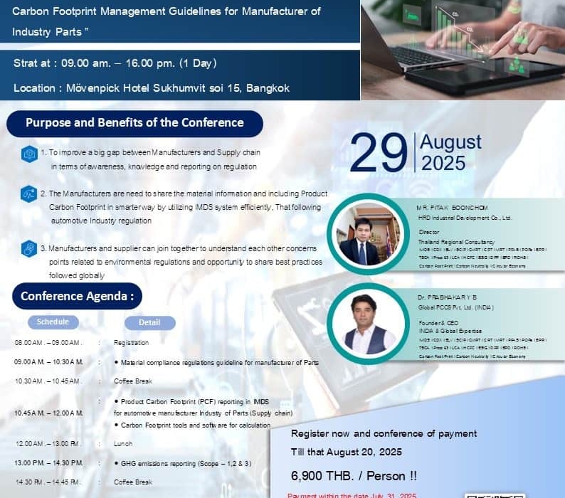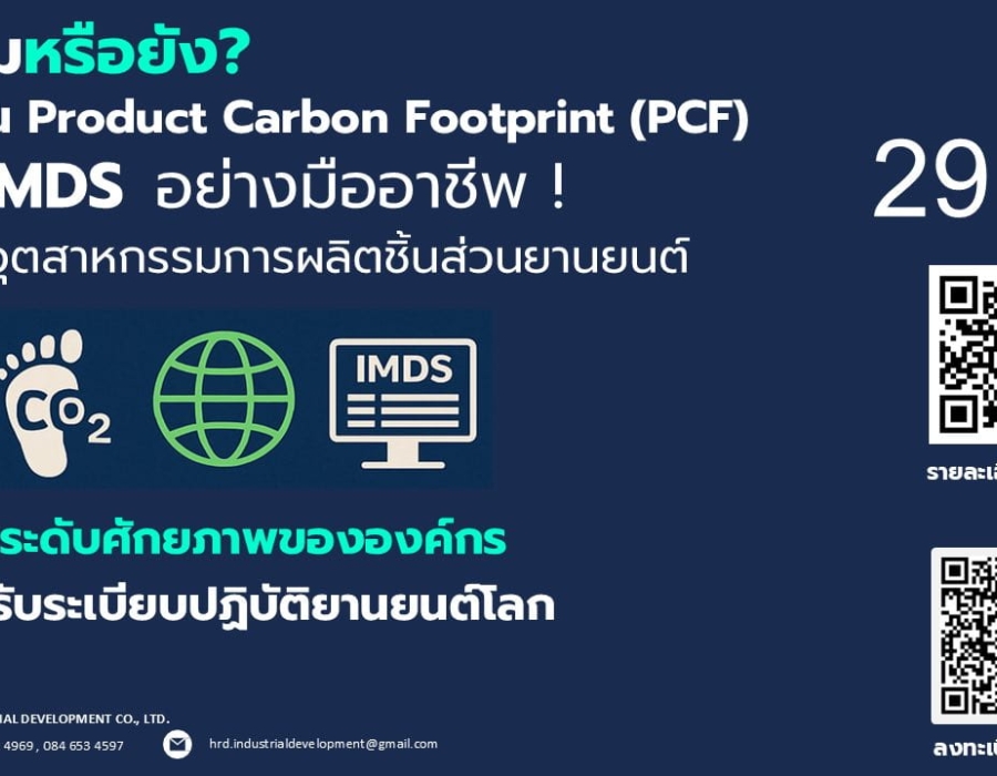ทางเรานำเสนอและขอเรียนเชิญท่านเข้าร่วมสัมมนาในหลักสูตร “การรายงานคาร์บอนฟุตพริ๊นของผลิตภัณฑ์ (PCF) ในระบบ IMDS สำหรับอุตสาหกรรมยานยนต์ และแนวทางการจัดการ PCF สำหรับผู้ผลิตชิ้นส่วน”