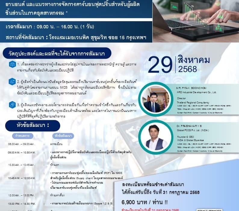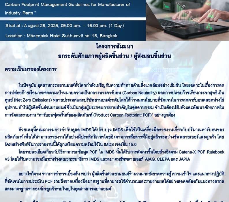 ขอเรียนเชิญ ท่าน และ Suppliers ผู้ผลิตชิ้นส่วน / ผู้ส่งมอบชิ้นส่วน เข้าร่วมสัมมนา หลักสูตร“ การรายงานคาร์บอนฟุตพริ๊นของผลิตภัณฑ์ (PCF) ในระบบรายงานข้อมูลวัสดุระหว่างประเทศ (IMDS) สำหรับอุตสาหกรรมยานยนต์ และแนวทางการจัดการคาร์บอนฟุตพริ๊นสำหรับผู้ผลิตชิ้นส่วนในภาคอุตสาหกรรม ”
